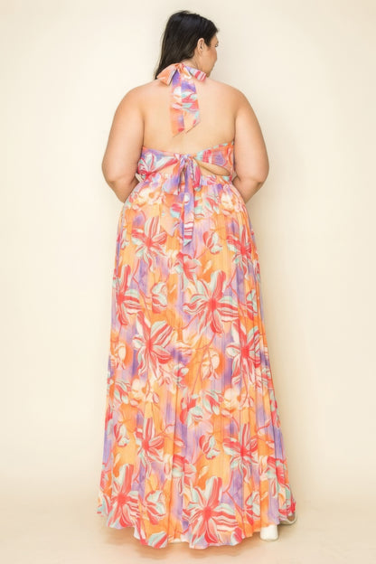 Chiffon Printed Pleated Cross Halter Key Hole Front Smocked Waist Maxi Dress