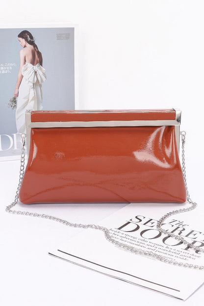 Elevate your evening attire with our Patent Leather Frame Clutch Bag, a stunning and sophisticated accessory that effortlessly adds a touch of luxury to any outfit. Crafted with a sleek polyurethane finish and accented with mixed metal details, this clutch is both stylish and durable.